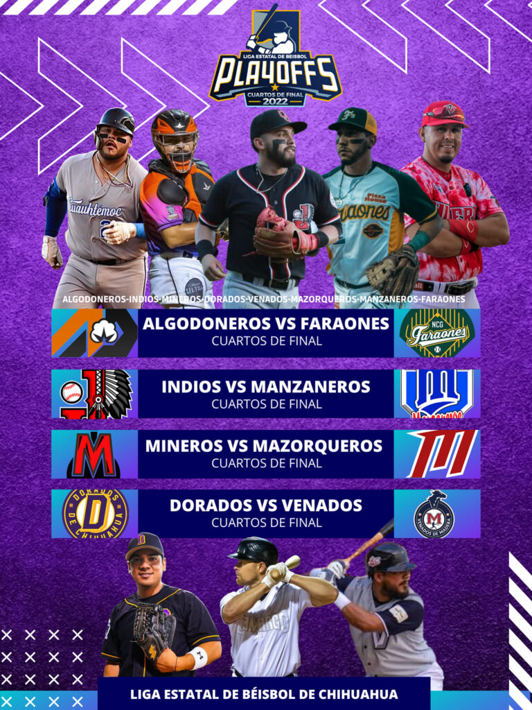 La etapa más esperada del Campeonato Estatal de Béisbol 2022 los playoffs, los cuartos de final a ganar 3-5 juegos posibles: Algodoneros  contra Faraones, Indios y Manzaneros, Mineros –Mazorqueros y Venados  contra  Dorados de Chihuahua.