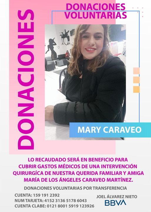 Piden ayuda, Mary Caraveo es una joven mujer que fue diagnosticada con cáncer, requiere una cirugía cuyo costo es de aproximadamente 400 mil pesos, su familia ha realizado diversas actividades para hacerse de recursos que permitan solventar dichos gastos; sin embargo han sido insuficientes y la intervención es URGENTE, se tiene programada para los últimos días del mes de enero próximo, si usted puede y desea donar, le dejamos el número de cuenta