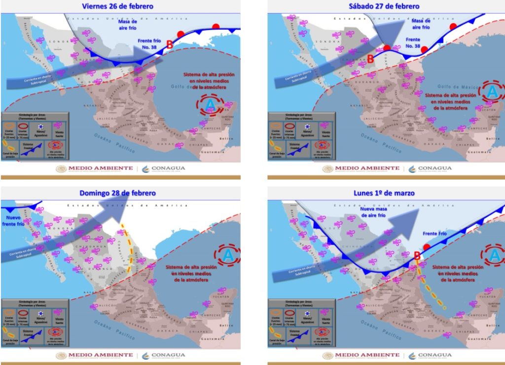 Para este viernes 26, el Frente Frío número 38 y su masa de aire en interacción con la corriente en chorro subtropical favorece un ambiente de gélido a muy frío por la mañana, y de cálido a caluroso por la tarde, con cielo mayormente nublado y viento de entre 15 y 30 kilómetros por hora (km/h).