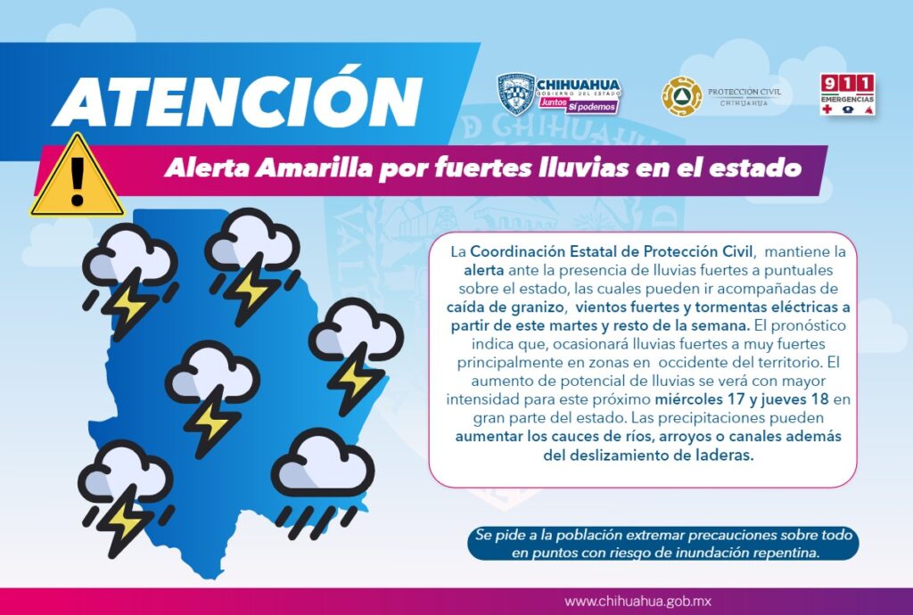 La Coordinación Estatal de Protección Civil, lanzó una alerta amarilla para todo el estado debido al potencial de lluvias que se presentará con mayor intensidad este próximo miércoles 17 y jueves 18; las cuales pueden aumentar los cauces de ríos, arroyos o canales y deslizamiento de laderas.