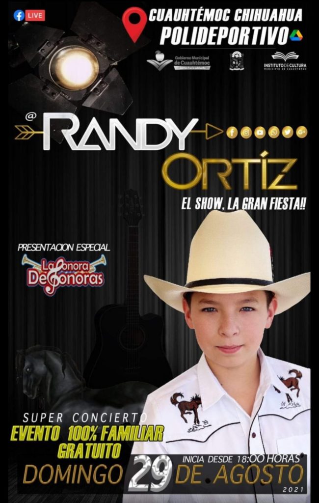 Como parte de las actividades organizadas en la cartelera cultural de agosto, el Instituto de Cultura del Municipio de Cuauhtémoc, invita a la población en general al concierto que ofrecerá el niño ganador del reality La Voz Kids, Randy Ortíz, el próximo domingo 29 de este mes en el polideportivo.