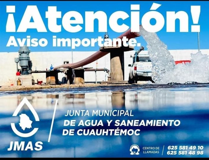 Cuauhtémoc, Chihuahua, 12 de noviembre de 2024 – La Junta Municipal de Agua y Saneamiento de Cuauhtémoc (JMAS) informa a los habitantes de la ciudad que, debido a una falla eléctrica en el Periférico Gómez Morin, reportada desde las 2:00 PM, nos hemos visto en la necesidad de suspender temporalmente el servicio de agua potable. Este incidente afecta a los pozos 52, 35, 53 y 60, que en conjunto suministran alrededor del 60% del agua que distribuimos en Cuauhtémoc.