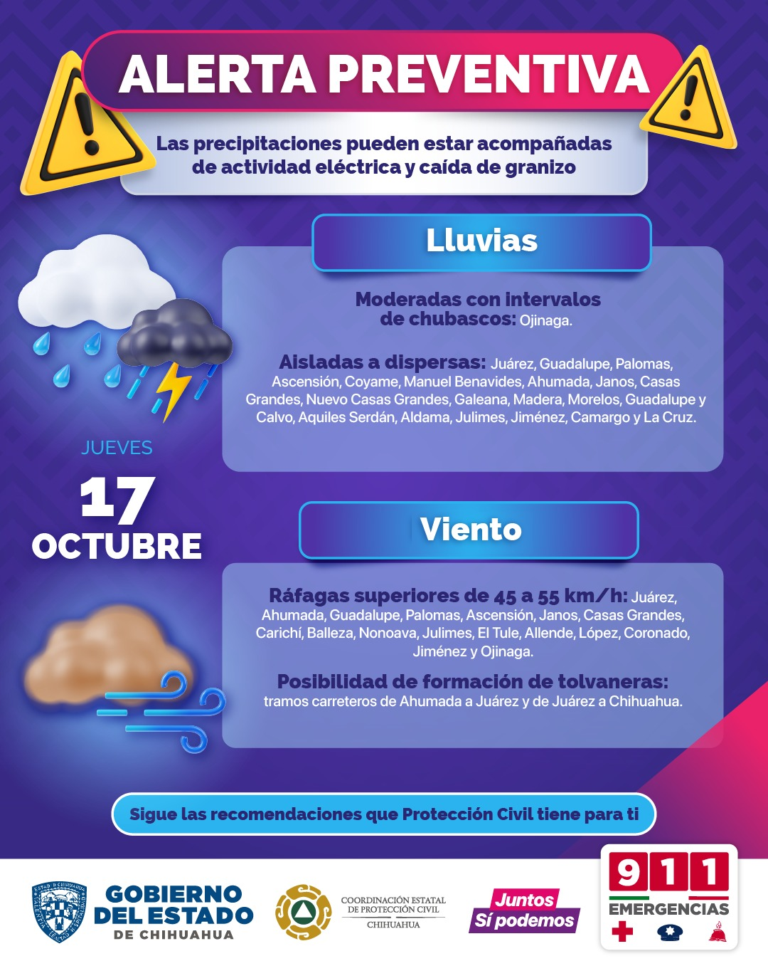 Estas condiciones estarían asociadas a ráfagas de viento que pueden superar los 45 km/h, en la región norte del estado. Además, se prevé la presencia de precipitaciones que podrían estar acompañadas de actividad eléctrica y caída de granizo en los municipios de las zonas norte, noroeste, suroeste, centro y sureste de la entidad.