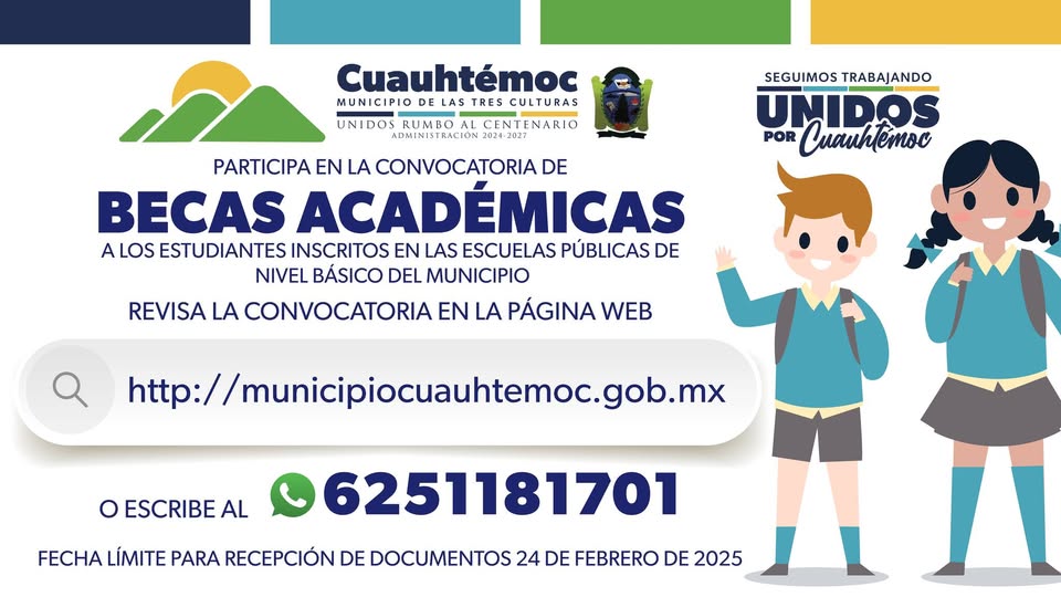 El Gobierno Municipal de Cuauhtémoc a través de la Dirección de Desarrollo Social invitan a participar en la Convocatoria de Becas Académicas, a los estudiantes de las escuelas públicas de nivel básico del Municipio.