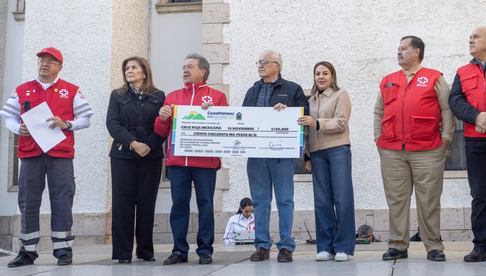 Cd. Cuauhtémoc, Chih.- En el marco del arranque del Radiotón 2025 de Cruz Roja Delegación Cuauhtémoc, el alcalde Beto Pérez realizó la entrega de un cheque por $150,000.00, como donativo a nombre del Gobierno Municipal de Cuauhtémoc.