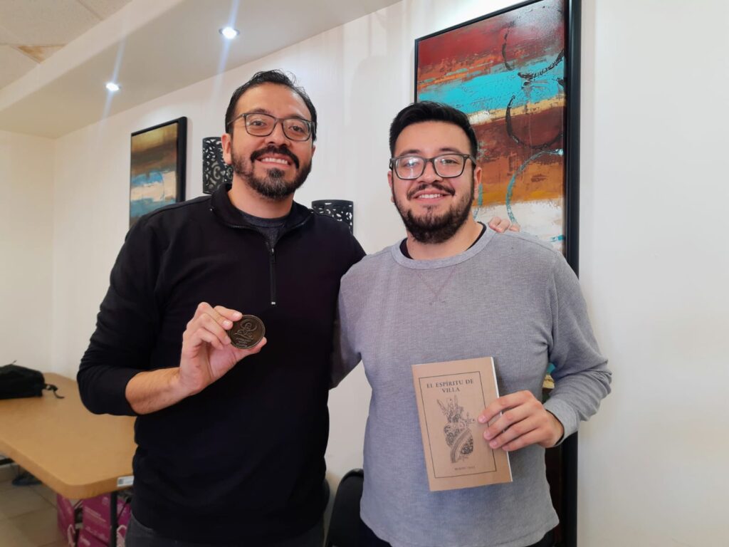Además, los bisnietos de Villa entregarán medallas a historiadores en Cuauhtémoc. Cada una incluye por un lado la réplica de una moneda que circulaba entre villistas en la época de la Revolución, con la leyenda “Muera Huerta” y el águila juarista; a quien se sorprendía con ella en su poder era condenado a muerte. Del otro lado, trae la imagen de Pancho Villa y la leyenda “Fundación Visión Villista”, que impulsan ambos jóvenes procedentes de la Ciudad de México.