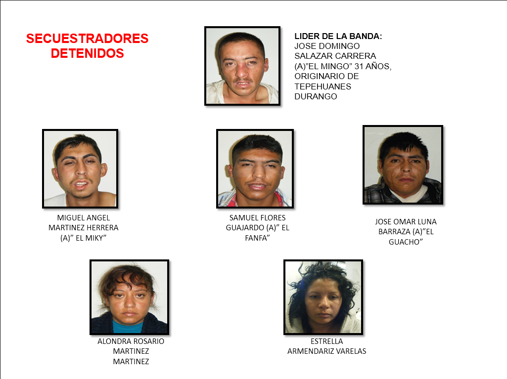 Entre los detenidos se encuentra el líder de la banda identificado como José Domingo Salazar Carrera alias “el mingo” de 31 años y originario de Tepehuanes, Durango.
