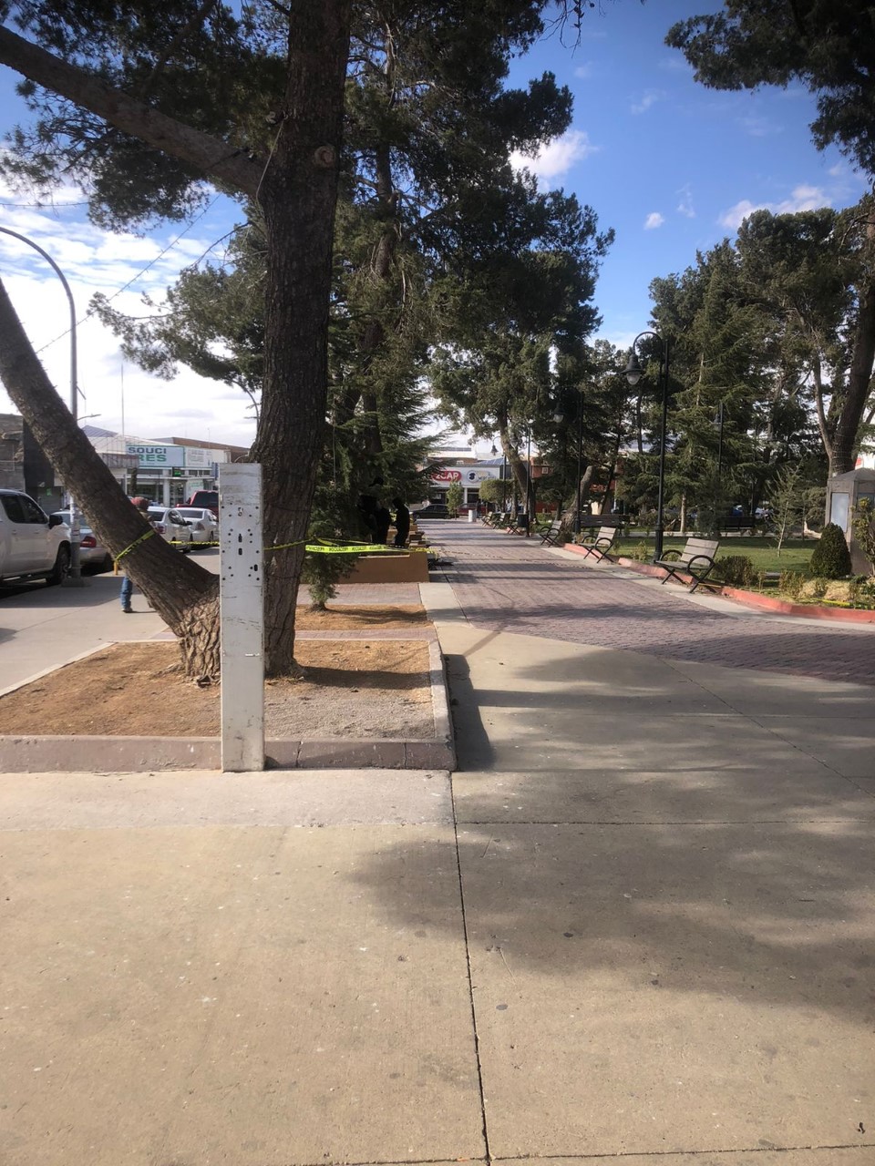 Existe el riesgo de colapso d de al menos 5 árboles de la plaza,. El lugar fue acordonado, no se puede no transitar por ese lugar, en caso de emergencias marcar al 911.