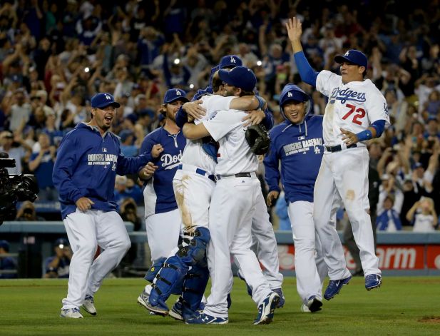 Tras su 107mo y último lanzamiento, un sonriente Kershaw levantó sus brazos sobre su cabeza y esperó el abrazo del enorme receptor A.J. Ellis.