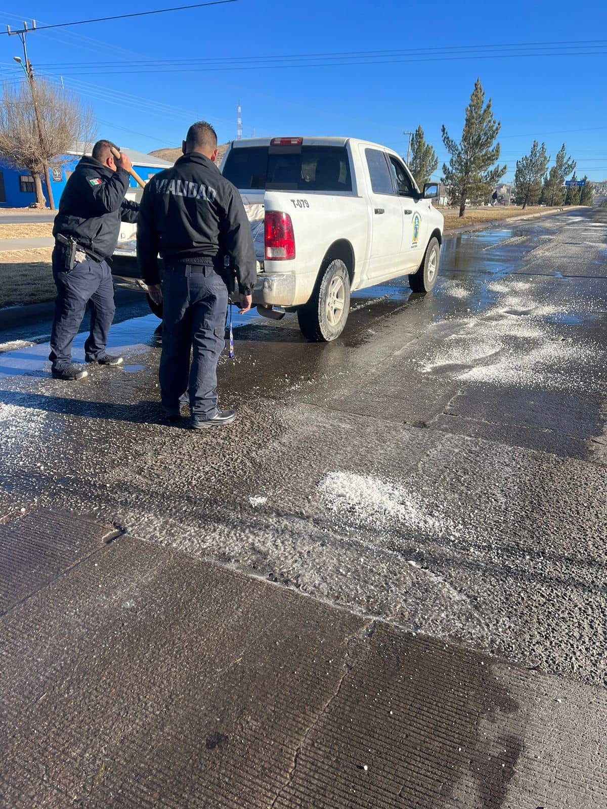La Dirección de Seguridad Pública Municipal a través de Vialidad y Tránsito, en coordinación con Protección Civil, aplicaron sal en vialidades congeladas por diversas fugas de agua.