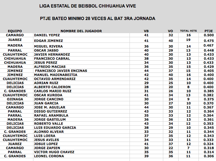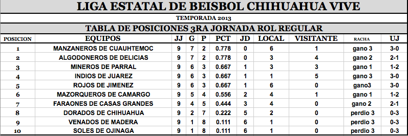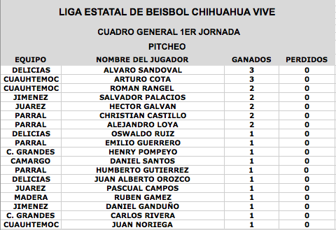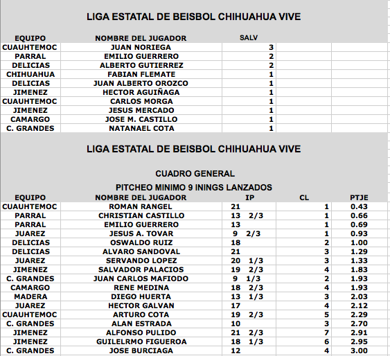 www.beisbolcuauhtemoc.com.- Los lanzadores Arturo Cota y Roman Rangel, sobresalen esta semana en los numeritos oficiales, el primero al tener ya 3 ganados sin conocer la derrota y el segundo, lanzando para 21 entradas y tener un minimo 0.43 en carreras limpias admitidas, todo esto al concluir tres jornadas del Campeonato Estatal de Beisbol.
