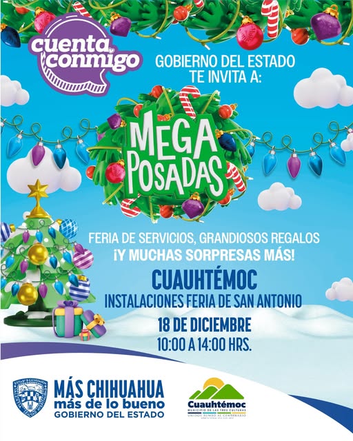 Gobierno del Estado llegará a Cuauhtémoc con una Mega Posada, en donde habrá muchísimas sorpresas para los asistentes: juguetes, bicicletas, despensas, cobijas, estufas, lavadoras, colchones, pantallas y muchas sorpresas más.