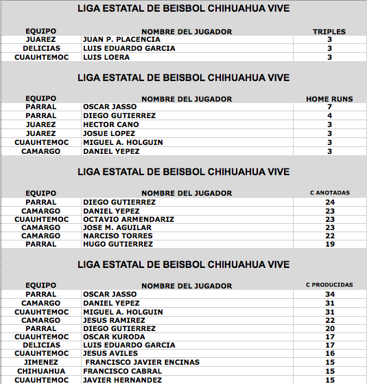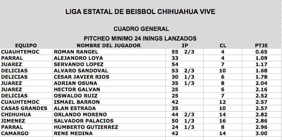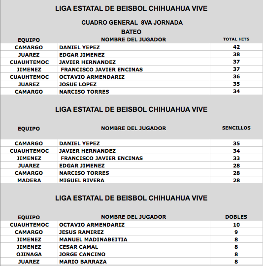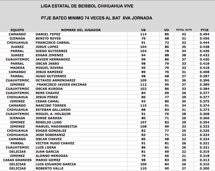www.beisbolcuauhtemoc.com.- Daniel Yepez, se apodero del liderato de bateo con un porcentaje de 0.494, en cuadrangulares sigue sobresaliendo Oscar Jasso con 7, en el departamento de pitcheo, el mejor en porcentaje es Roman Rangel con un 0.65 en carreras limpias admitidas en tanto en ganados sigue siendo Alejandro Loya con marca de 5-0.