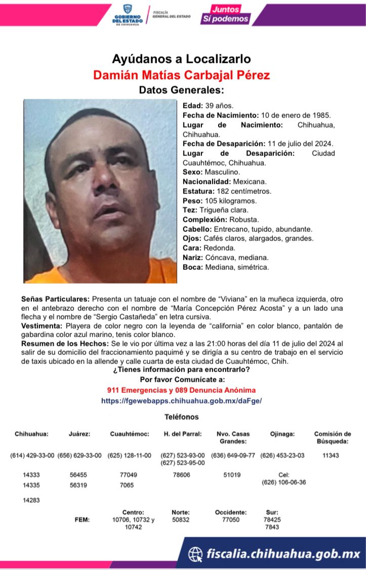 Cuauhtémoc Chih.- Autoridades, emitieron la pesquisa de taxista del sitio Estrella desaparecido, no regreso a casa, por lo cual solicitan a la ciudadanía, su colaboración para tratar de localizarlo.