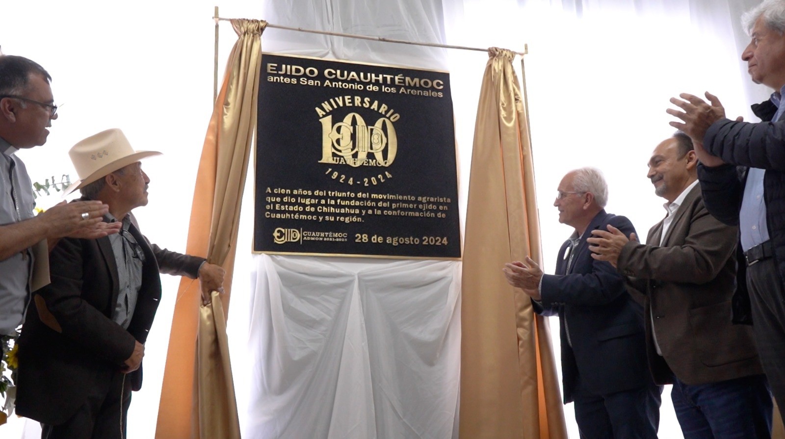 Cd. Cuauhtémoc, Chih.- Por invitación del presidente del Ejido Cuauhtémoc, David Aranda Miranda, el alcalde Beto Pérez acudió como invitado especial a la develación de la placa por el 100° aniversario del Ejido Cuauhtémoc.