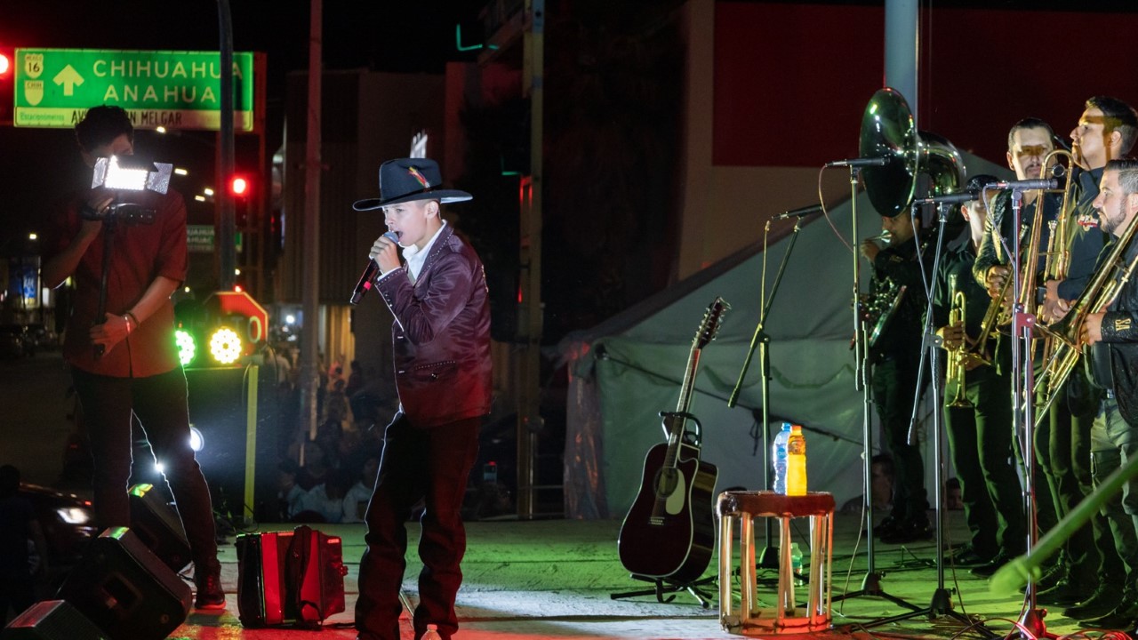 Cd. Cuauhtémoc, Chih.- En el marco del Trigésimo Festival de las Tres Culturas, se llevó a cabo la Verbena Regional en la Plaza Principal, que cerró con un concierto a cargo de Randy Ortiz, cantante cuauhtemense de 13 años de edad, quien ha recorrido gran parte del país con sus presentaciones, luego de ganar La Voz Kids en 2021. Estuvo acompañado de la Banda San Antonio y entre las melodías que interpretó estuvo la que lo hizo ganador: Mi enemigo el amor; además de su sencillo: Me gusta pensarte. Randy Ortíz cautivó a un nutrido público, con el que compartió que cuando tenía 6 años fue precisamente frente a la Plaza Principal, en un Festival de las Tres Culturas, donde cantó por primera vez, siendo parte del Mariachi de la Academia Municipal de Artes. La Verbena contó con la participación del menonita “Pancho Pantera”, quien estuvo acompañado de talentosos jóvenes músicos de su comunidad, que orgullosamente interpretaron música regional mexicana. El público también se deleitó con el Ballet Folclórico Cuetzapalin, que cuenta con 23 años de trayectoria, y está integrado por estudiantes de la Primaria y Preescolar Particular Cuauhtémoc, Bachillerato Colegio Cuauhtémoc y Instituto Cristóbal Colón, quienes presentaron del proyecto “México, Canto y Danza”. Haciendo gala de la música centroamericana, apareció en el escenario Wabi Sabi, grupo musical de Cuauhtémoc, integrado por Dively González, Paulina Luján, Iván Flores, Félix Ruíz, José Dávila y Alfredo Rascón, quienes presentaron “El canto de los pueblos andinos”. También se contó con la presencia de Evelin Rivera, cantante cuauhtemense de 25 años, quien ha participado en diversos concursos de canto, entre ellos La Voz 2021. Interpretó música regional mexicana y estuvo acompañada del Mariachi Juvenil Cuauhtémo