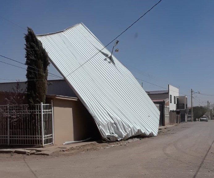 *Desprendimiento de una estructura metálica, parte de la techumbre de una vivienda en las calles 54 y Teotihuacán de la colonia Miguel Sígala, sin personas lesionadas.