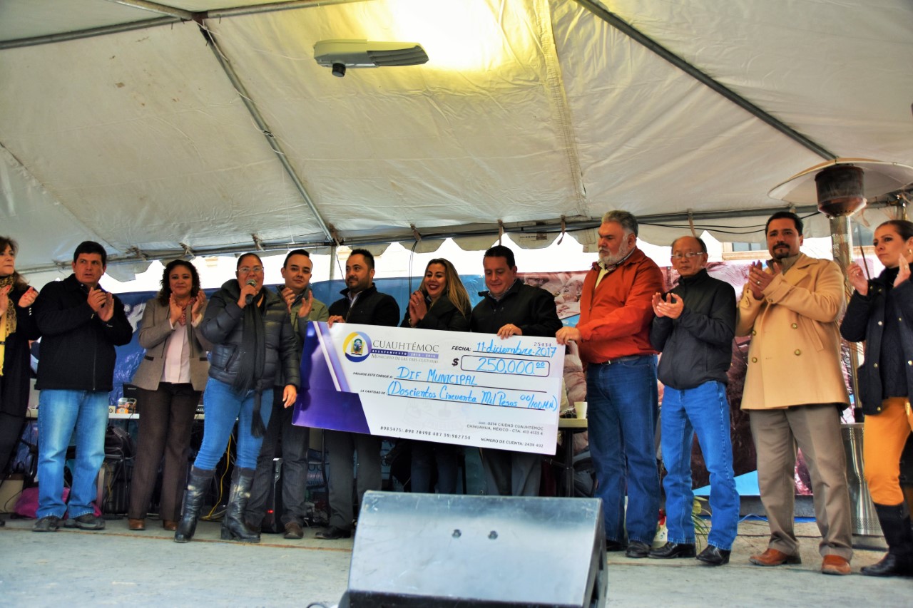 Cd. Cuauhtémoc, Chih.- El alcalde Humberto Pérez Holguín entregó a un cheque por la cantidad de 250 mil pesos como donativo para el Hogar del Abuelo, en el marco del Radiotón 2017 que se realiza en la explanada de la Presidencia Municipal, en favor de nuestros ancianitos.