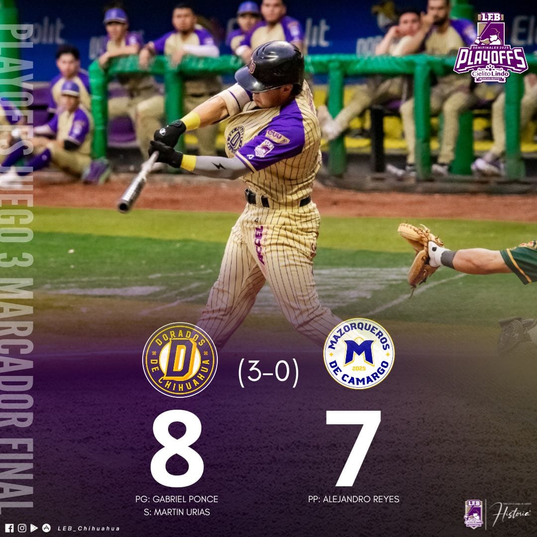 Martín Urías llegó del bullpen en la novena entrada, a tirar cinco strikes consecutivos, con la casa llena y un solo out, para apagarla rebelión local, guiando a los Dorados de Chihuahua a un triunfo de 8-7 sobre los Mazorqueros de Camargo, al reanudarse este viernes las semifinales de la LEB “Cielito Lindo” 2025.
