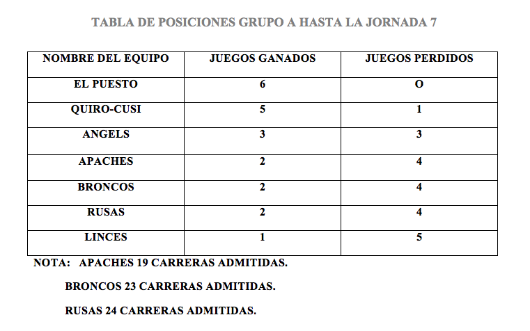 En el Grupo “A”, aparece El Puesto con marca de 6-0, le sigue Cusi con 5-1, Broncos 3-3, Apaches 2-4, Angels 2-4 , Rusas 2-4 y Linces con 1-5.