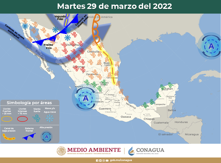 De acuerdo con el reporte del Servicio Meteorológico Nacional (SMN), para los días lunes y martes el ingreso del frente frío 39 y la presencia de una vaguada polar, que recorrerán el noroeste y norte del territorio nacional y provocarán descenso de temperatura, vientos muy fuertes a intensos y tolvaneras sobre las regiones mencionadas.