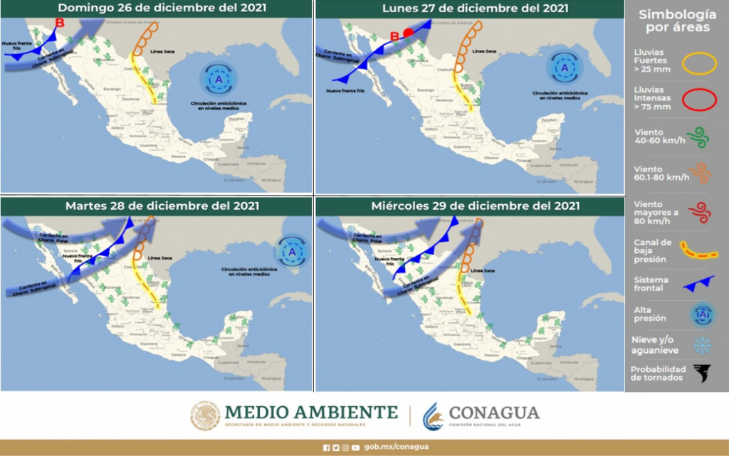 La aproximación de este sistema frontal, ocasionará desde este lunes 27 hasta el miércoles 29 de diciembre vientos fuertes de entre 50 y 75 kilómetros por hora (km/h) en Janos, Casas Grandes, Madera, Ignacio Zaragoza, Gómez Farías, Namiquipa, Bachíniva, Guerrero, Bocoyna, Carichí, Cuauhtémoc, Riva Palacio, Majalca.