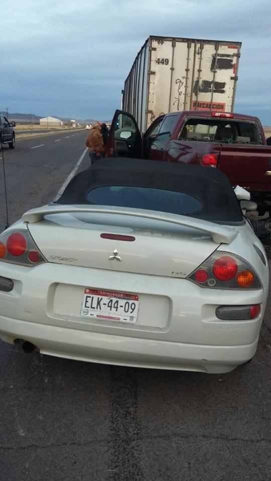 Los otros dos vehículos involucrados son el tráiler Freightliner, color azul, modelo 1976 y La unidad oficial, Chevrolet, Silverado, color guinda con placas de circulación EE 74526 del estado de Chihuahua.