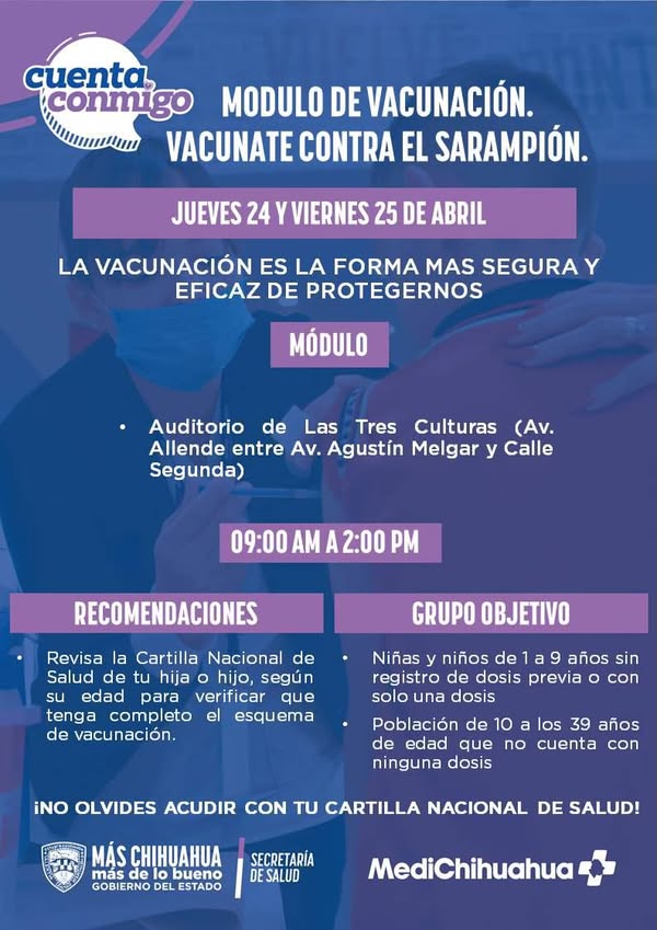 El módulo de vacunación contra el sarampión estará el jueves 24 y el viernes 25 de abril en el Auditorio de las Tres Culturas, en un horario de 9 de la mañana a 2 de la tarde ¡Corre la voz! Revisa las cartillas de vacunación de tus hijos. Recuerda que si eres un adulto menor de 39 años y no tienes la seguridad de haber sido vacunado contra esta enfermedad, puedes acercarte a solicitar la dosis.