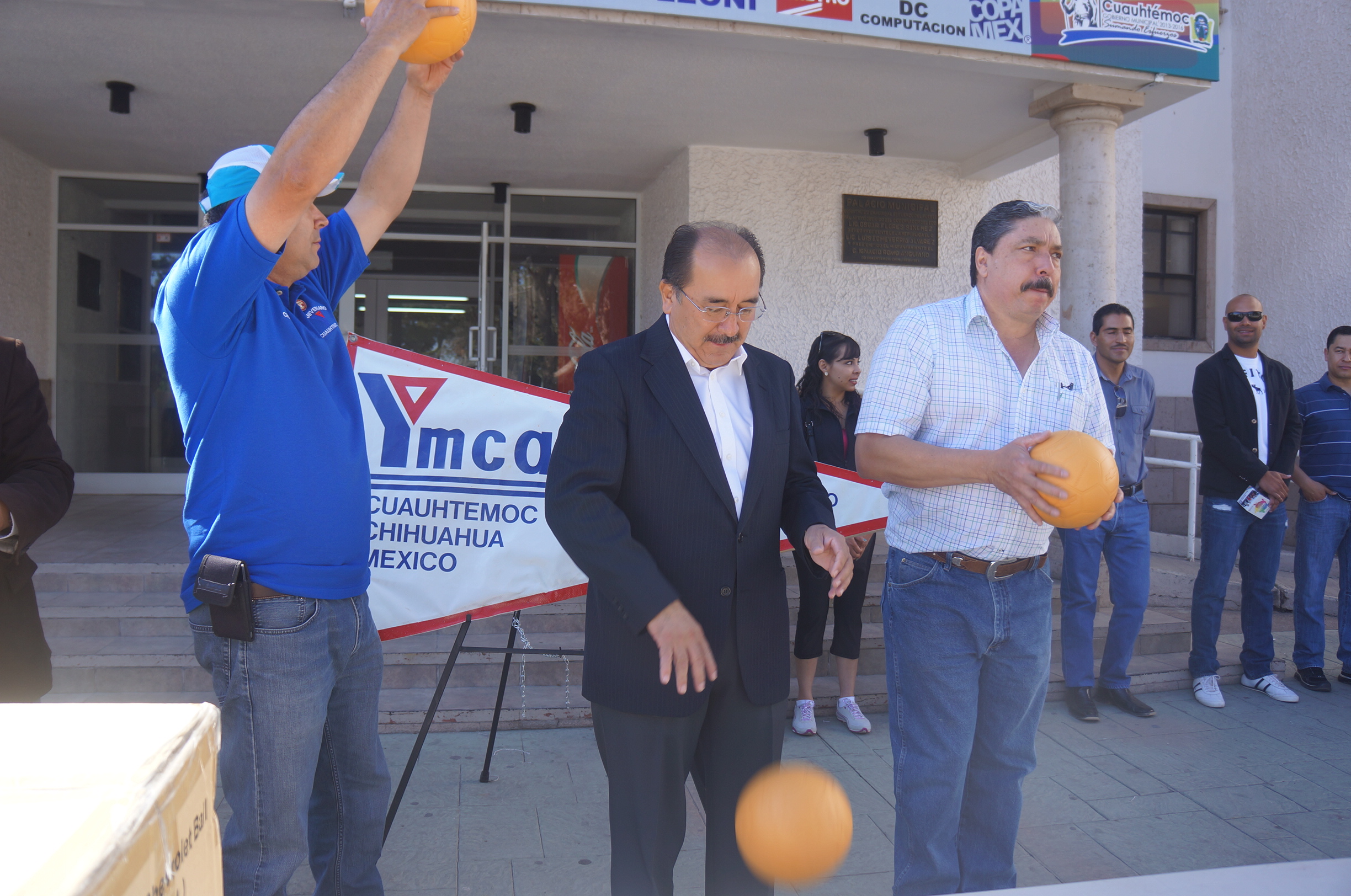 Cuauhtémoc.- El alcalde Heliodoro Juárez González fue testigo de la entrega que YMCA realizó esta mañana en la explanada de la presidencia para dotar de balones a escuelas locales de futbol.
