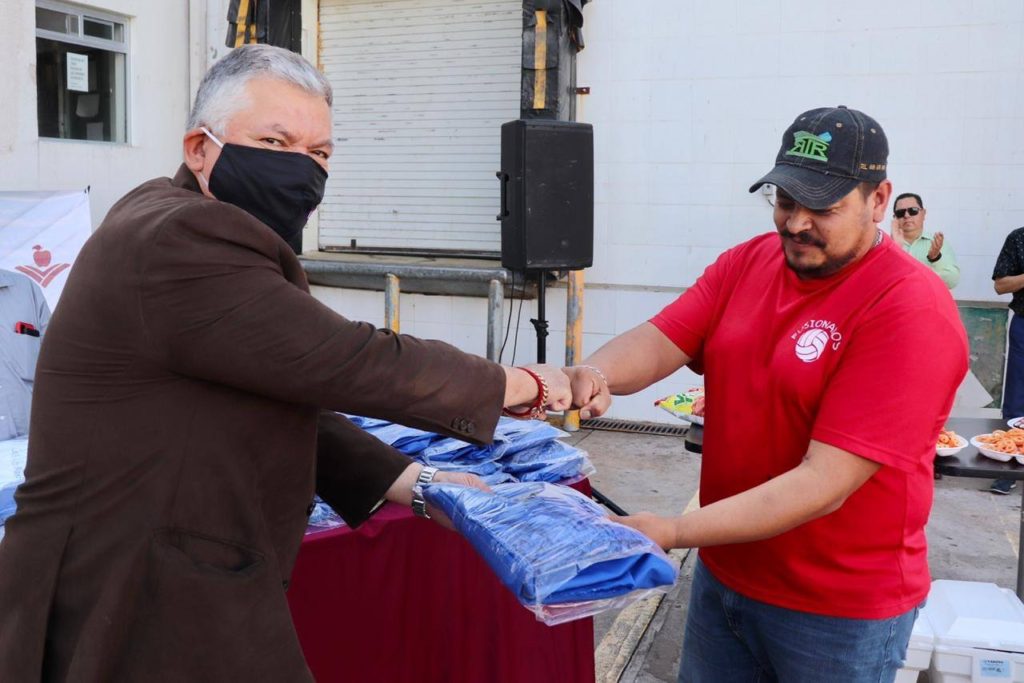 Acompañado del Secretario del Ayuntamiento, Francisco Sáenz Soto, así como del Director del organismo municipal descentralizado, José Alfredo Sáenz Espino, el Alcalde repartió 44 paquetes de camisolas y pantalones a mismo número de trabajadores, para lo cual fueron invertidos 24 mil pesos.