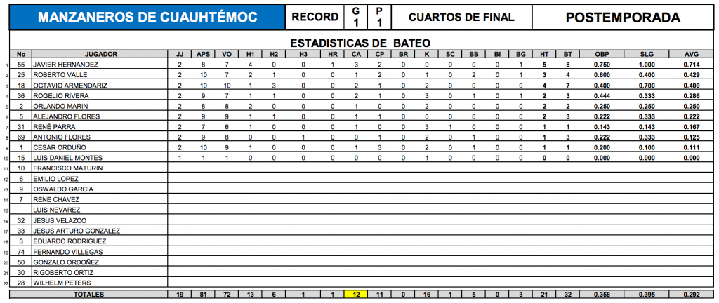 www.beisbolcuauhtemoc.com.- Dentro de los numeritos de Manzaneros de Cuauhtémoc en los playoffs, Javier “Piolin” Hernández es el mejor bat del representativo de la Sexta Zona, al tener un porcentaje de 0.714, producto de 7 turnos oficiales, 5 hits totales entre ellos un cuadrangular, 3 carreras anotadas y 2 producidas.
