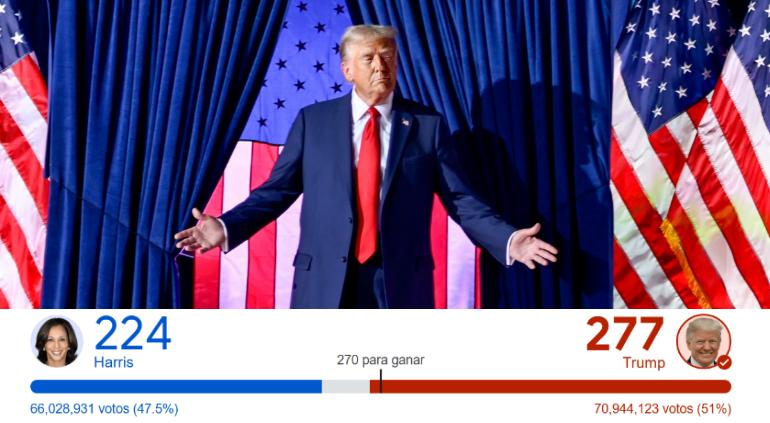 La agencia Associated Press (AP) expuso que Donald Trump consiguió 277 votos, que ya son más de los 270 necesarios para obtener la victoria. Su principal rival, Kamala Harris cuenta actualmente con 224 votos.