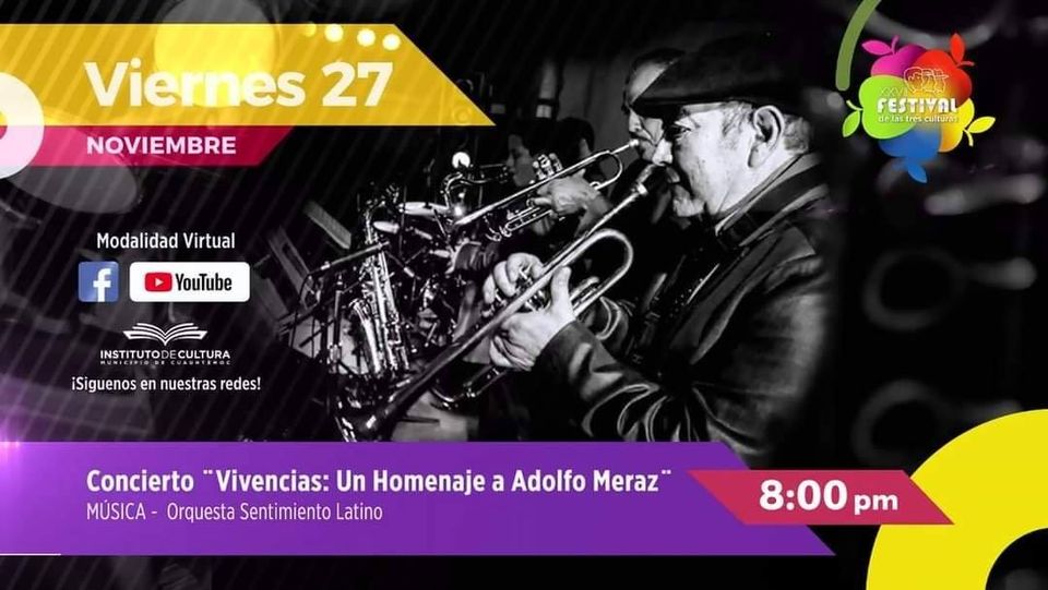 El maestro Adolfo Meraz fue la primer persona reconocida con la Medalla al Mérito Cultural “Esteban López Solis”, en el año 2019. Su huella y su legado imborrable en la comunidad cuauhtemense, son enormes. A casi un año de su partida, su amada Orquesta Sentimiento Latino, preparó el concierto “VIVENCIAS: UN HOMENAJE A ADOLFO MERAZ”, en un esfuerzo por enaltecer aún más su memoria y apreciar desde otros ángulos su música. ¡Disfruta de una noche inolvidable este fin de semana!