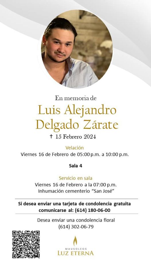 “Gracias a todos y a todas aquellas personas que de corazón nos acompañaron en sus oraciones. Los amamos! Dios nos dio a Luis Alejandro Dios nos lo quitó! Alabado sea El Señor!. Les pido 1 segundo más de su tiempo, volteen al cielo y den gracias a Dios por los 19 años de vida de Luis Alejandro.