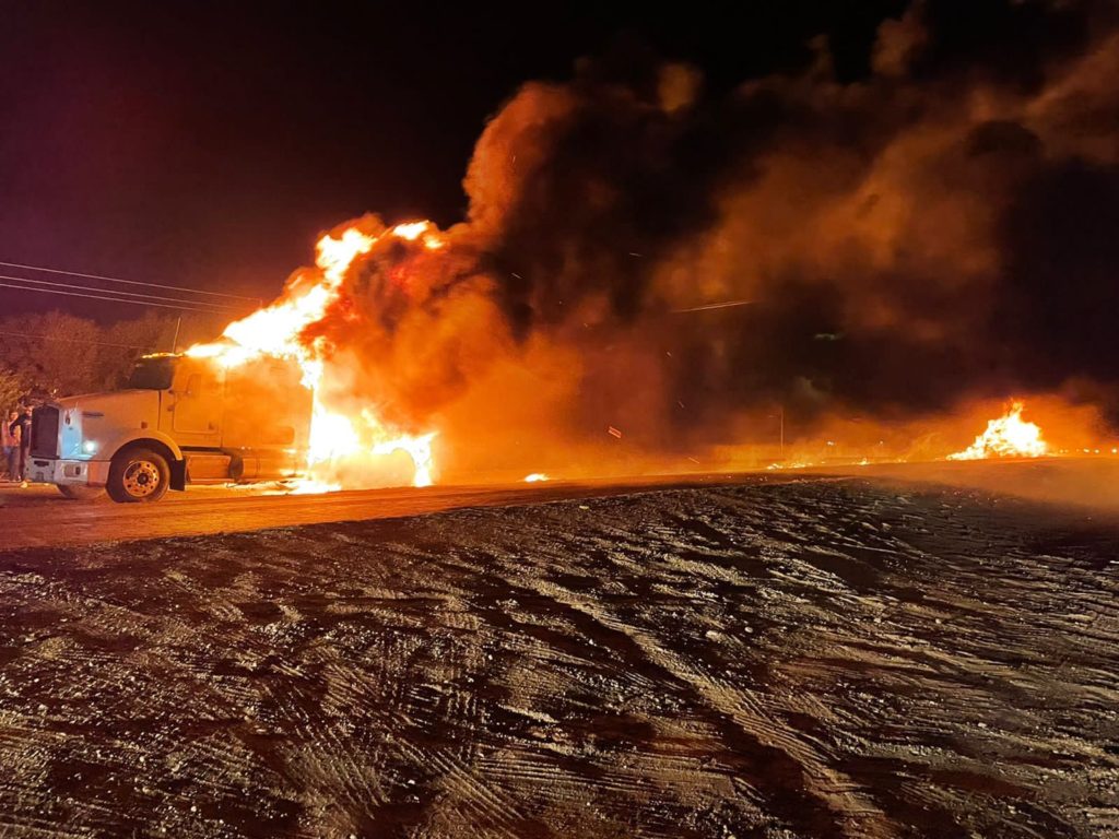 El sistema de emergencias 9-1-1 recibe el llamado de auxilio y los policías se dirigen al lugar de los hechos donde se entrevistan con el señor Salvador R.M., de 52 años de edad y chofer de tractocamión, quien explica que el escape del trailer incendió la lona con la cual llevaba tapadas las pacas de alfalfa y popote de avena, ocasionando el fuego que consumió la totalidad del automotor y la carga.