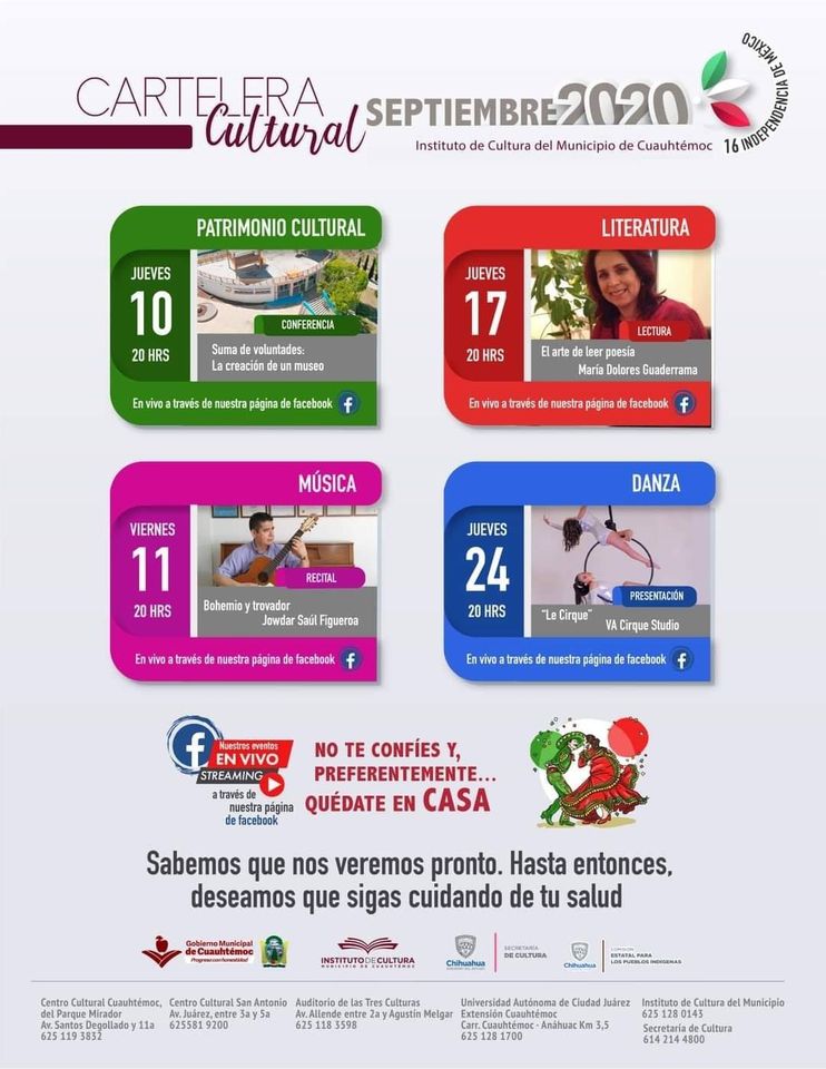 Todos los eventos serán transmitidos de manera gratuita en punto de las 20 horas, a través de la página de Facebook del Instituto de Cultura.
