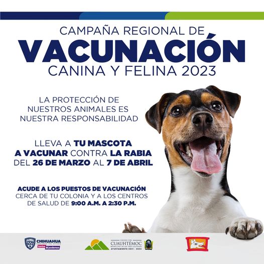 El Gobierno Municipal de Cuauhtémoc en coordinación con el Sector Salud, invita a llevar a tus mascotas a la Campaña Regional de Vacunación Canina y Felina 2023.