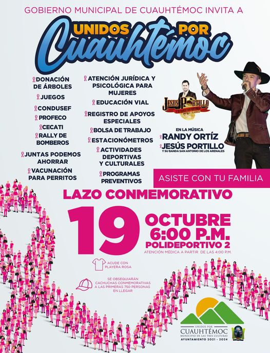 El Gobierno Municipal de Cuauhtémoc te invita a ponerte la playera rosa y ser parte del GRAN LAZO HUMANO con motivo de la prevención del cáncer de mama. La cita es en la cancha de futbol del Polideportivo II, el jueves 19 de octubre a las seis de la tarde ¡Llega temprano y recibe una cachucha conmemorativa! ¡Unidos por las mujeres! ¡Unidos por Cuauhtémoc!