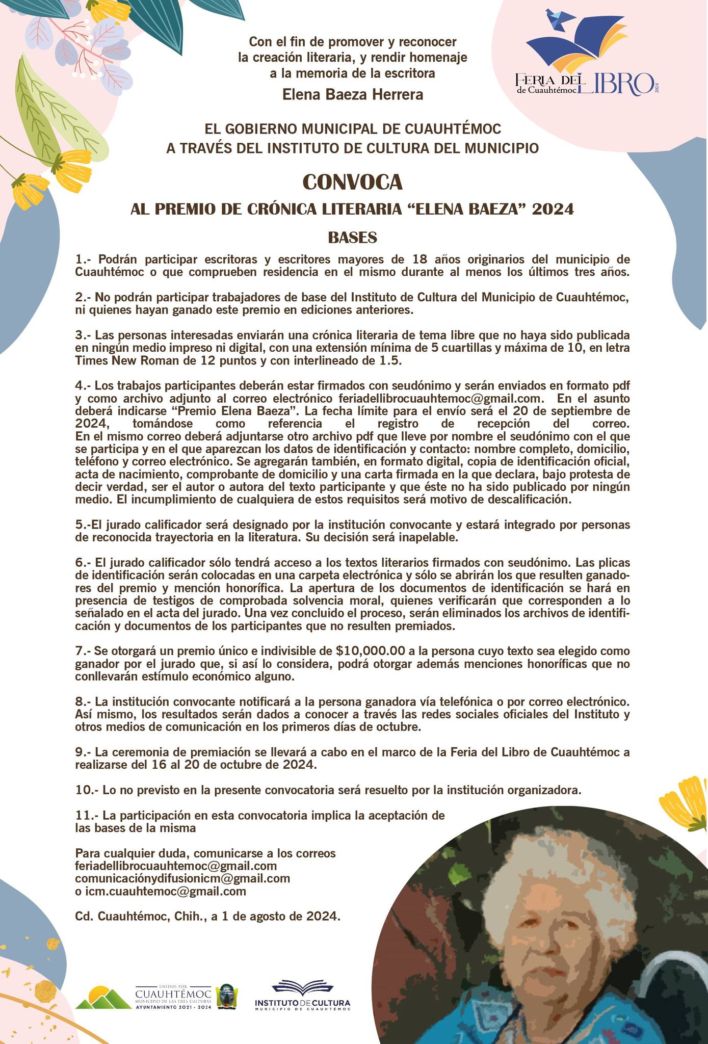 Cd. Cuauhtémoc, Chih.-Ell Instituto de Cultura del Municipio de Cuauhtémoc, invita a participar en los premios literarios “Alma Rosa Estrada”, de poesía, y “Elena Baeza”, de crónica.