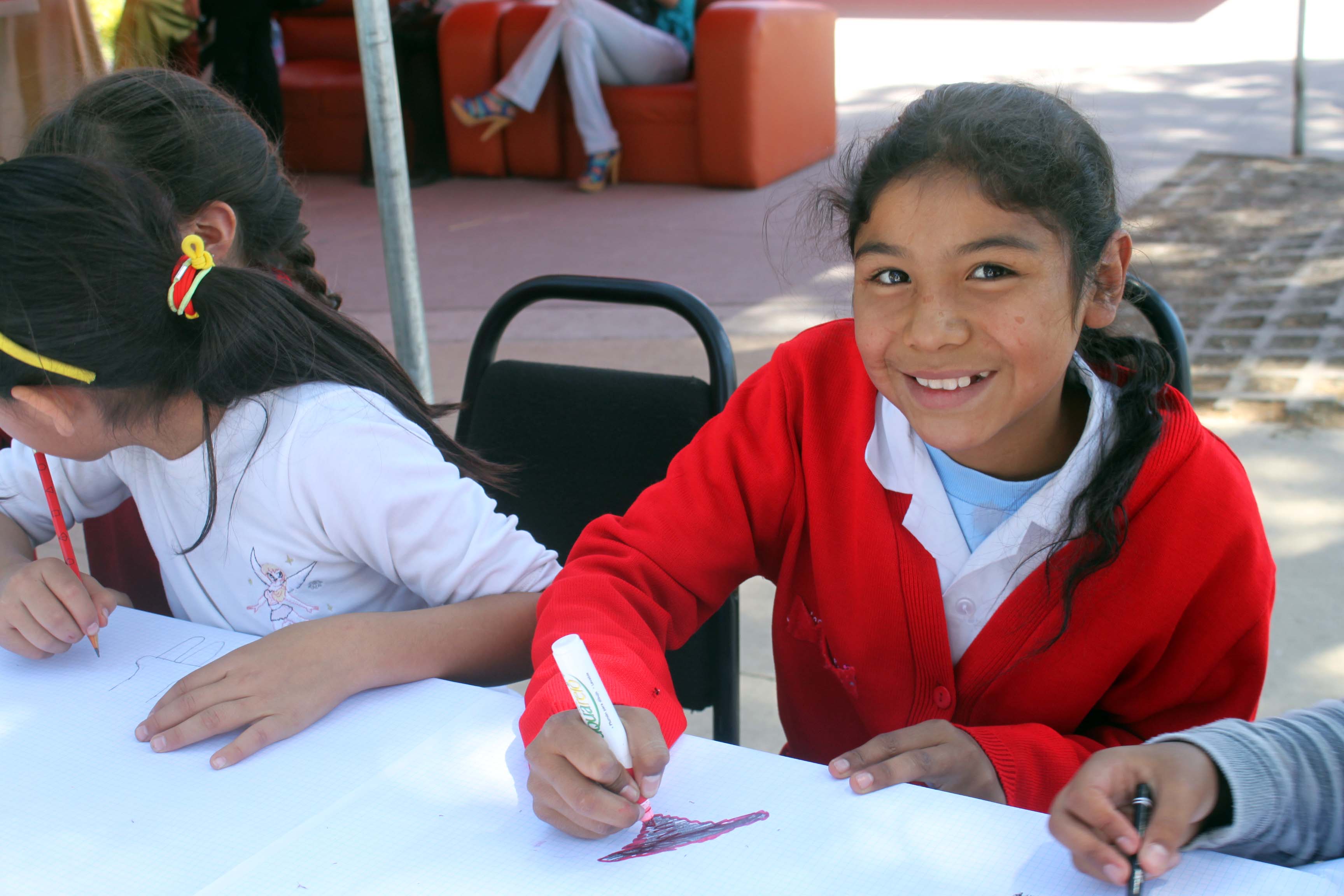 En carpas colocadas en la plaza, los grupos de niños de primaria jugaban a leer y a desarrollar otras actividades como pintura, dibujo y la convivencia entre estudiantes universitarios, quienes también aprendieron de ellos al ofrecerles figuras hechas con globos, pintura facial y otras actividades.
