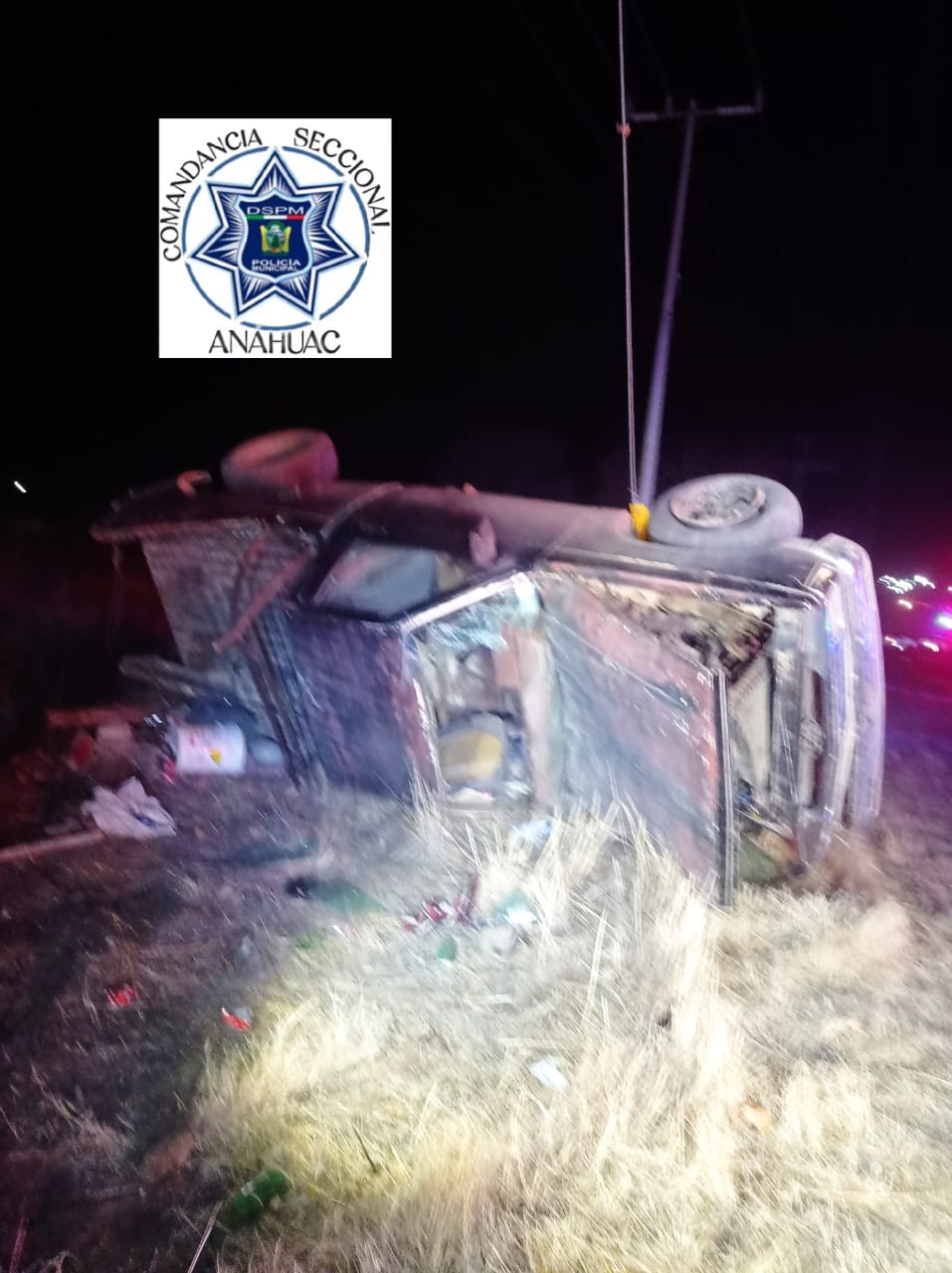 La Policía Vial de Anáhuac, informó que se registró un accidente, una salida de camino en el kilómetro 59+250 de la carretera Anáhuac a Cuauhtémoc, a las 22:10 horas del 07 de enero. En este hecho hubo personas lesionadas y una posible fuga de gas.