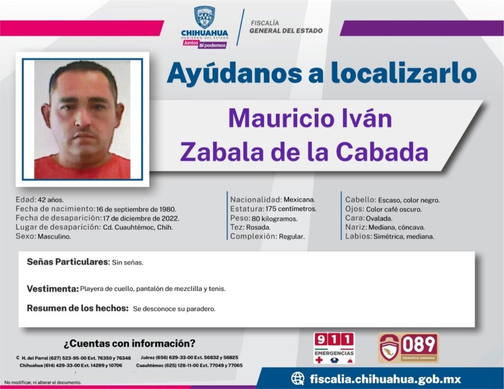 La mañana del sábado 17 de diciembre, sus familiares acudieron a solicitar auxilio para dar con el paradero de esta persona de 42 años de edad, cuyo vehículo de alquiler que conduce fue encontrado abandonado esa misma mañana en las calles Río Ejido y Río Bravo del Barrio Santa María en la ciudad de Cuauhtémoc.