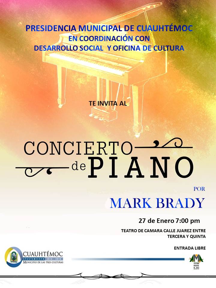 Cd. Cuauhtémoc, Chih.- La Presidencia Municipal de Cuauhtémoc, a través del Departamento de Cultura de la Dirección de Desarrollo Social, invita al Concierto de Piano que dará el irlandés Mark Brady.