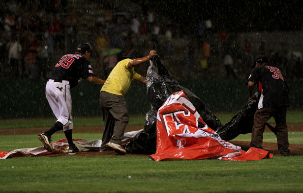 Hugo Gutiérrez sacó imparable al jardín derecho y remolcó la carrera de la quiniela para la causa visitante. En ese momento la lluvia se intensificó y el partido se detuvo; 45 minutos después los umpires decidieron dar otra media hora de gracia para esperar que las condiciones del campo fueran las idóneas para jugar, pero la situación no cambió y el duelo fue suspendido de forma definitiva.
