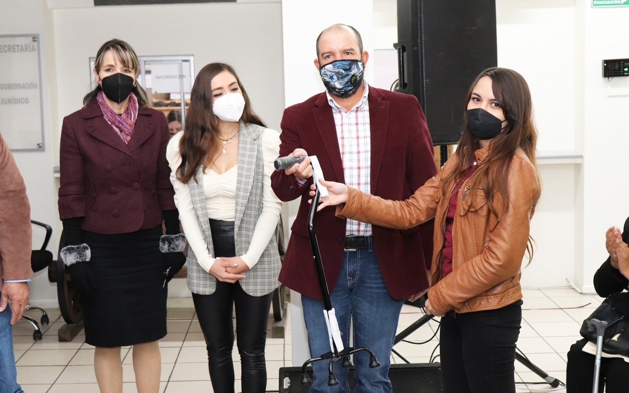 Para garantizar la inclusión y la mayor seguridad de los adultos mayores y personas con alguna discapacidad motriz, el Gobierno Municipal de Cuauhtémoc realizó la entrega de bastones de apoyo a beneficiarios y representantes de asociaciones civiles, no obstante los centros comunitarios fungirán como centros receptores de solicitudes hasta completar la dotación de 76 de estos artículos disponibles.