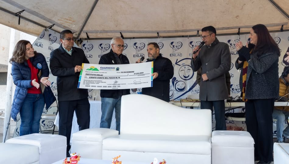 Cd. Cuauhtémoc, Chih- A nombre del Gobierno Municipal, el alcalde Beto Pérez realizó la entrega de un cheque por $120 mil pesos a Instituto de Entrenamiento para Niños con Lesión Cerebral y Trastornos de Aprendizaje, A. C., Enlac.