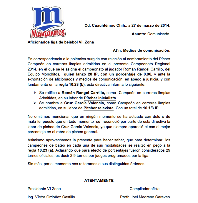 www.beisbolcuauhtemoc.com.- La directiva de la Sexta Zona, en un comunicado de prensa, informa que se determino en nombrar a Cruz Garcia Valencia, lanzador de Teporakas, como campeón en carreras limpias admitidas como pitcher relevista.