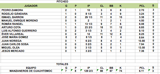www.beisbolcuauhtemoc.com.- Después de cinco jornadas, Octavio Armendáriz se mantiene con el mejor bateo, al tener un porcentaje de 0.424, producto de 66 turnos oficiales y 28 hits, en carreras producidas aparece Alfredo Macías con 18. En el departamento de Pitcheo, Pedro Zamora tiene la mejor efectividad con un 2.70 en carreras limpias admitidas y el mejor en ganados y perdidos es Ismael Barron con marca de 2-0.