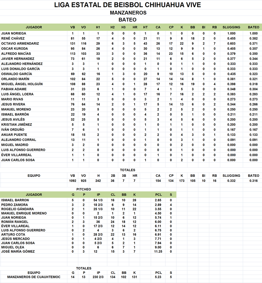 www.beisbolcuauhtemoc.com.- Los numeritos oficiales de los Manzaneros de Cuauhtémoc hasta la novena jornada, dejan como el mejor bateador a René Chávez, producto de un 0.382 de porcentaje, en tanto en el pitcheo, Ismael Barron ya puso sus números en 5 ganados sin conocer la derrota, ademas de tener la mejor efectividad con un 2.65 en carreras limpias admitidas.