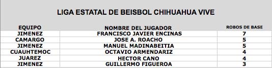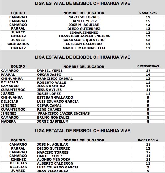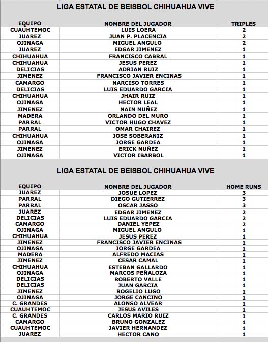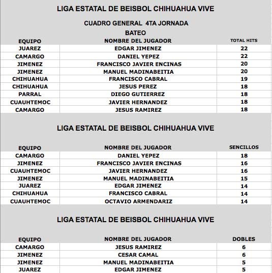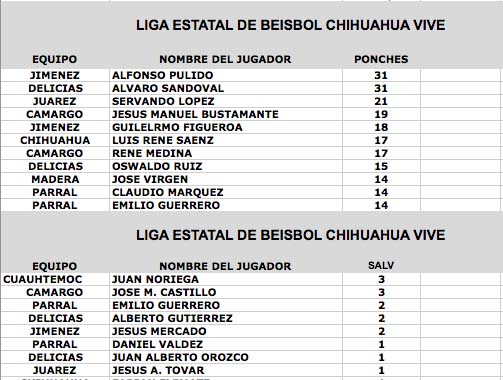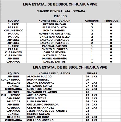 www.beisbolcuauhtemoc.com/Foto: Javier Enríquez – Llegaron los numeritos oficiales hasta la cuarta jornada del Campeonato Estatal de Beisbol Manuel “Meme” Saenz, Jesus Ramirez de Camargo es el lider de bateo con un .581 de porcentaje, en el departamento de cuadrangulares aparecen de lideres; Oscar Jasso y Diego Gutierrez de Parral, al igual que Josue Lopez de Juarez con 3, en el pitcheo el lider en efectivad es Christian Castillo de Parral con un 0.66 de efectividad.